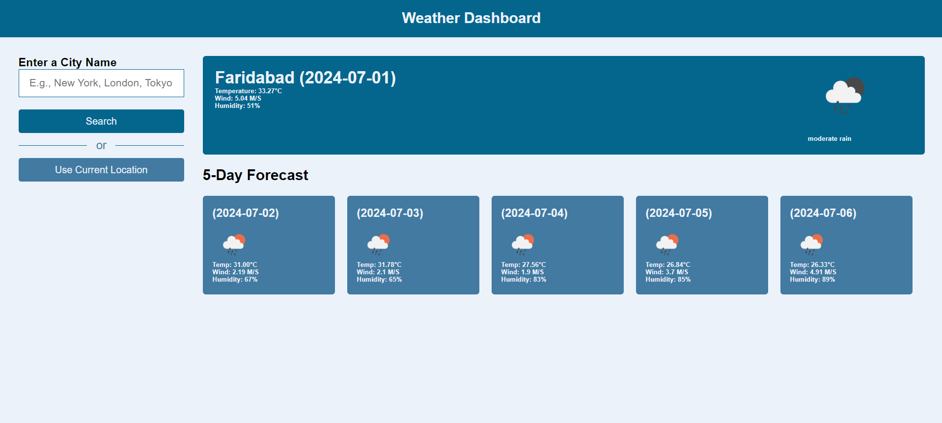 It is a weather dashboard that can show the weather of any location for 5 days.